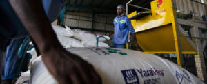 Workers carrying bags of fertilizer at a warehouse in Njombe, Tanzania. ABIDJAN, Côte d’Ivoire,...