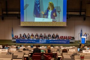 IOM Director General Amy Pope delivers remarks as representatives from Member States attend the...