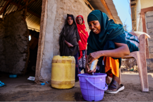 A woman washes her dishes with clean water that she drew from the water...