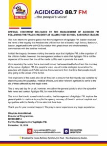 The management of popular Ibadan radio station, Agidigbo FM has disclaimed as false, the...